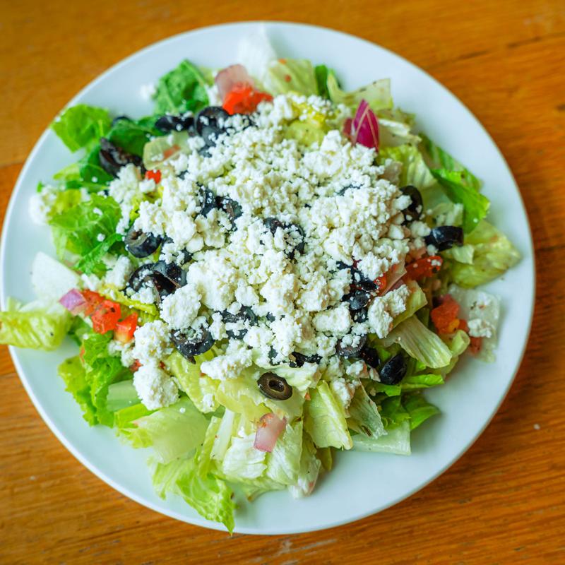 Romaine lettuce, sliced black olives, red onion, grape tomatoes, feta cheese with house-made Greek dressing
