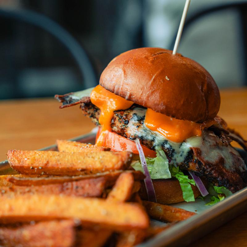 2 Beef patties, bacon, cheddar, blue crumbles, tobacco onions, hickory BBQ